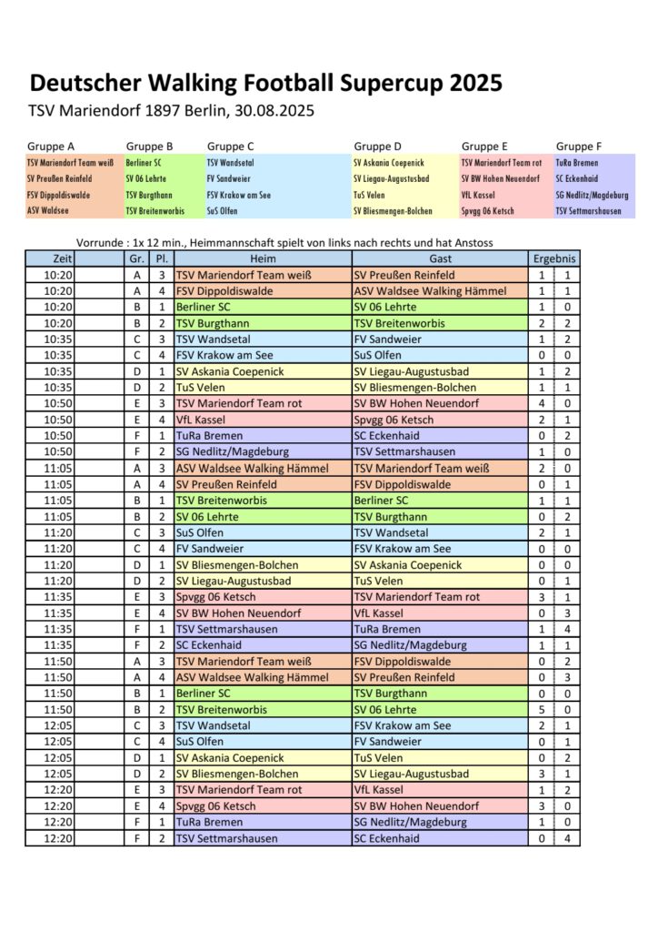 Am 30.August fand der 2. Deutsche Walking Football Supercup in Berlin statt. Ausrichter war der TSV Mariendorf 1897. Das Besondere an diesem Turnier war, dass Mannschaften aus allen 16 Bundesländern vertreten waren. Das hat es in der Art in Deutschland bisher noch nie gegeben!