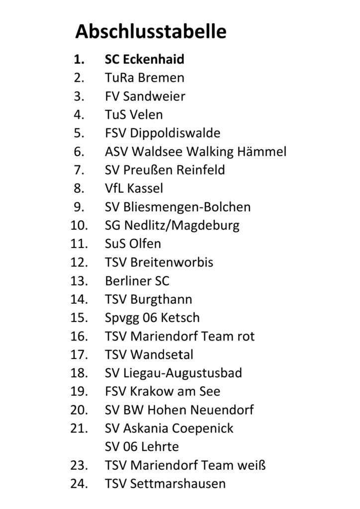 Durch das Spielsystem war uns nach dem 4ten Spiel der Weg nach ganz oben versperrt. Wir konnten uns in den Folgerunden den 15ten Platz erspielen und konnten 9 Mannschaften hinter uns lassen. Ein dickes Lob unseren befreundeten Vereinen aus Waldsee (Platz 6) und Sandweier (Platz 3).