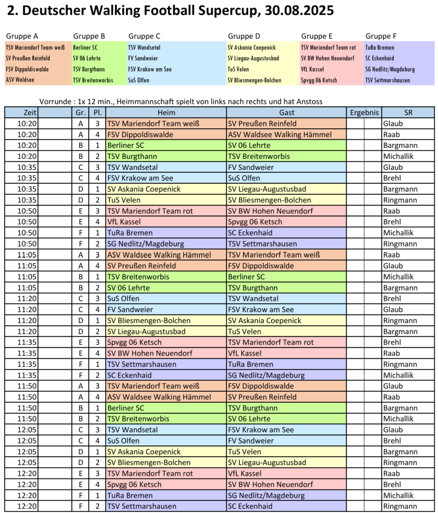 Und zwar zum 2. Deutschen Walking Supercup am letzten Augustwochenende. Ausrichter ist der TSV Mariendorf. Am Start sind 24 Mannschaften aus allen Bundesländern. Der Turnierplan verspricht auf jeden Fall schon einmal einen langen, sportlichen Tag.